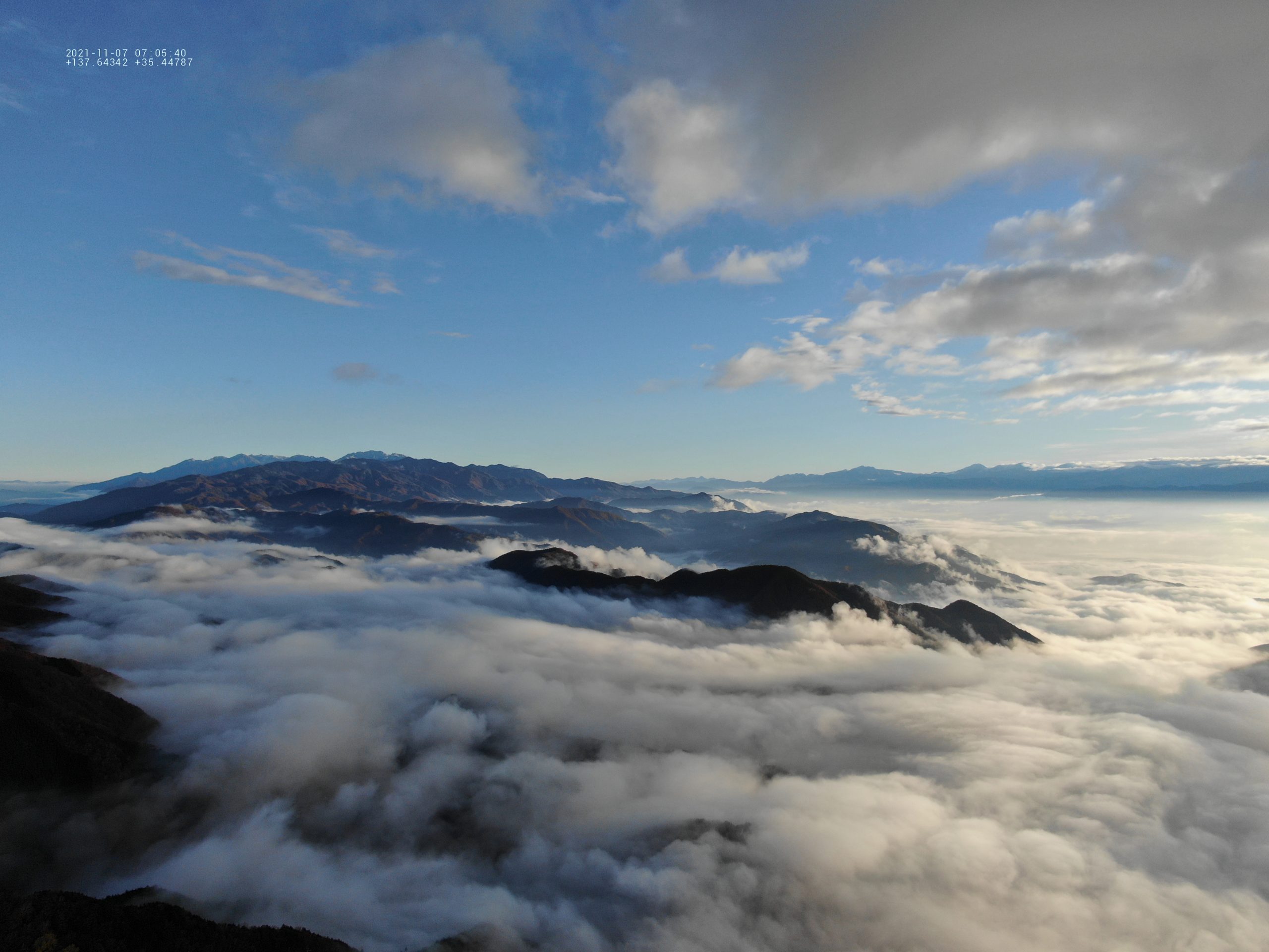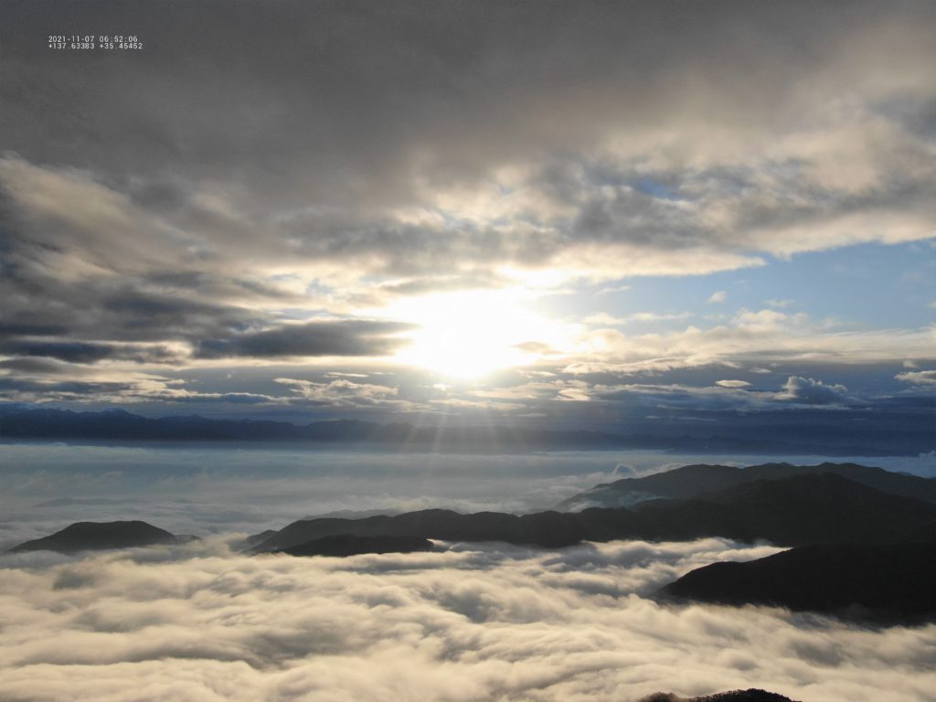 天空の楽園 ヘブンス園原の雲海ハ-バ- ドロ-ン撮影ヘンブンスそのはら 2021.11.072021.12.14 ゴンドラとリフト乗り継ぎ標高1,600mの展望台まで上ると、遠くは南アルプスまで広がる雲海に出会えます。夜半に山間部を低気圧が通過し湿度が高くなったとき、放射冷却によって地表面が冷え、熱が上空へ逃げて冷やされることで空気中の水分が霧となって発生し、その霧が盆地状地形や谷沿いの底に溜まる現象をいいます。伊那谷は典型的な盆地地帯です。秋から冬にかけて朝方地表が朝霧で乳白色に覆われるのは、この地方の風物詩でもあります。 朝日の雲海「光と雲」